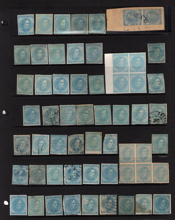 Lote 1236 /oConfederacy, 1862, 5¢ Jefferson Davis, De La Rue printing, light blue and Archer & Daly printing, blue (Scott 6, 7), an interesting group of 58 stamps, generally Fine to Very Fine. Scott $1,267+. Estimate $200 - 300. |