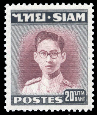 Thailand, 1948, King Bhumibol, 20b black & rose brown (Scott 273), o.g., very lightly hinged, Very Fine. Scott $450.