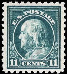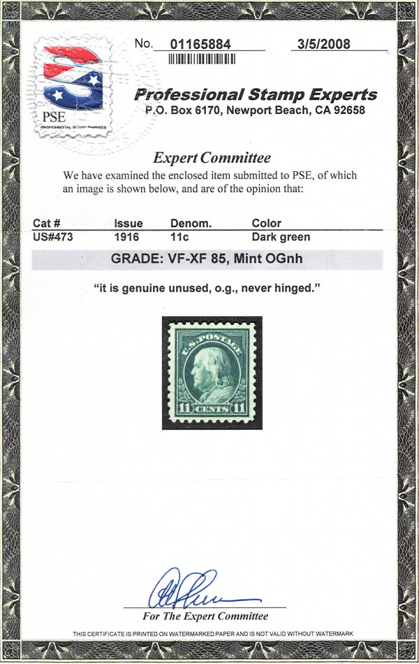Lote 131![]() ![]() 1916, 11¢ Franklin, dark green, unwatermarked, perf. 10 (Scott 473), o.g., never hinged, Very Fine to Extremely Fine, with 2008 P.S.E. certificate graded VF-XF 85. Scott $110. SMQ $150. Estimate $100 - 150. |