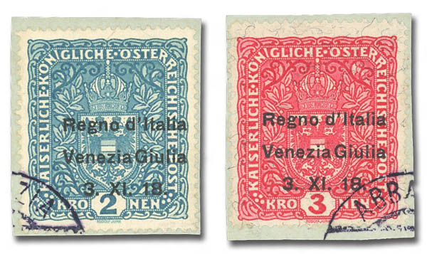 Lote 134![]() Austria: Italian Occupation of Venezia-Giulia, 1918, 2kr light blue and 3k carmine rose on granite paper (Scott N15, N19. Sassone 15, 16), each tied on separate piece by light "ABBAZIA" cancels, Fine to Very Fine, with 2020 Avi certificate for a set of three but only two stamps remain in this lot. Scott $1,200. Sassone €2,150 ($2,340). Estimate $300 - 400. |