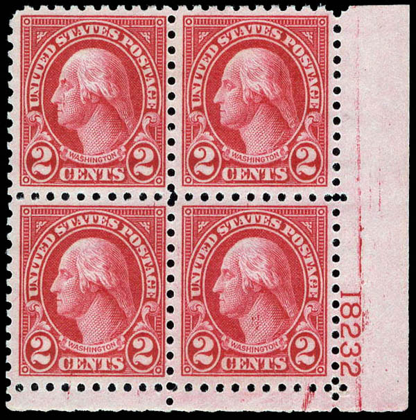 1924, 2¢ Washington, rotary press printing, perf. 10 (Scott 583), plate block of 4, o.g., never hinged, Fine to Very Fine. Scott $110.