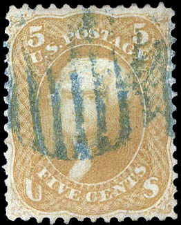 1861, 5¢ Jefferson, brown yellow (Scott 67a), premium blue cancel; tiny crease, Very Fine appearance. Scott $1,130.