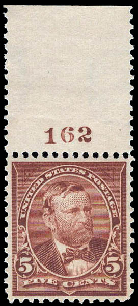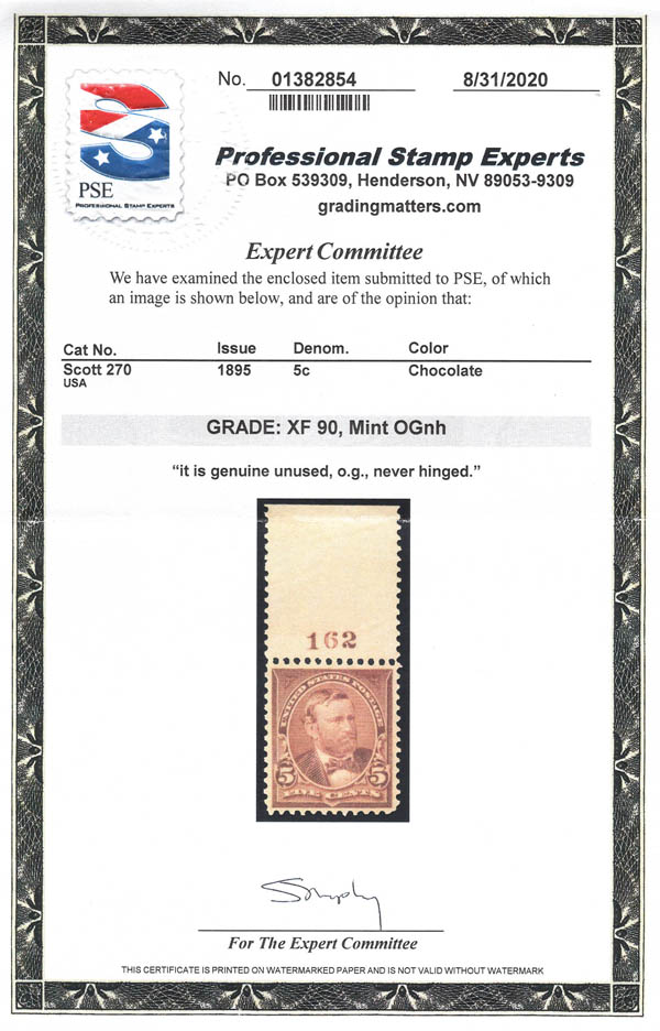 Lote 16![]() ![]() 1895, 5¢ Grant, chocolate, D.L. watermark (Scott 270), plate number single, o.g., never hinged, Extremely Fine, with 2020 P.S.E. certificate graded XF 90. Scott $105. SMQ $300. Estimate $200 - 300. |