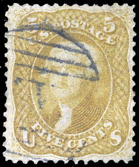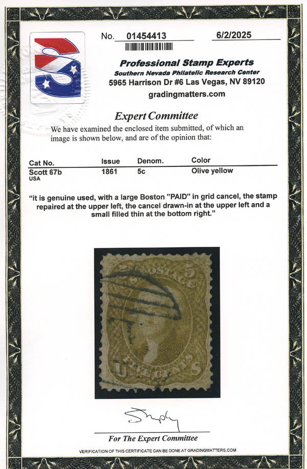 1861, 5¢ Jefferson, olive yellow (Scott 67b), nicely centered, large Boston PAID in grid cancel; faults, Fine appearance, with 2025 P.S.E. certificate. Scott $4,850.