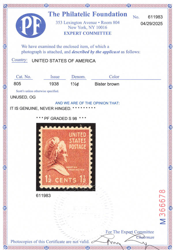 1938, Presidential Issue, 1½¢ Martha Washington (Scott 805), o.g., never hinged, Superb, with 2025 P.F. certificate graded SUP 98. SMQ $75.