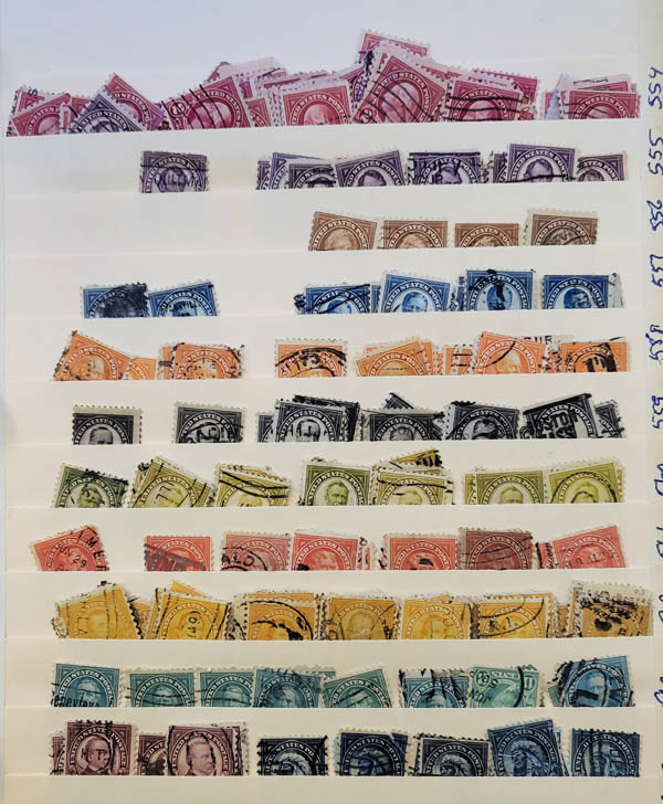 Lote 166 o 1920-2000, an enormous dealers stock of used stamps, in 11 large 3-ring binders, containing tens of thousands of used singles, neatly arranged by Scott number, including regular issues, commemoratives and some back-of-the-book. Quantities are generally in the 1-25 range. Some faults, but generally Fine to Very Fine. A small sampling has been imaged. Shipping weight 57 lbs / 26 kilos. Estimate $60 - 80. |