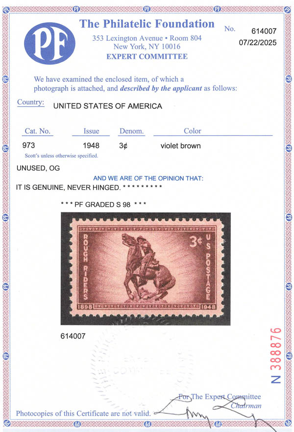 1948, 3¢ Rough Riders (Scott 973), o.g., never hinged, Superb, with 2025 P.F. certificate graded SUP 98. SMQ $85.