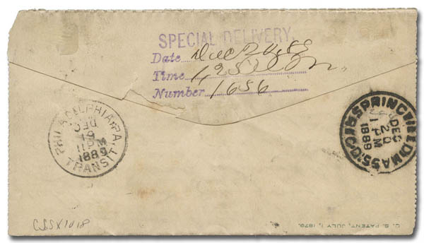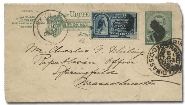 Lote 187![]() Special Delivery, 1888, 10¢ blue (Scott E2), used in 1889 on a 2¢ Grant lettersheet (U293), with contents, from Bryn Mawr, Pa. to the "Republican Office" in Springfield, Mass, with Philadelphia and Springfield backstamps. Back flap separated (a bit of glue would cure this), Fine to Very Fine overall. Estimate $300 - 400. |