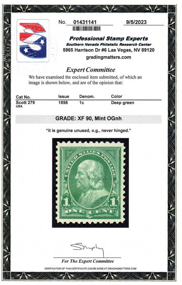 1898, 1¢ Franklin, deep green (Scott 279), o.g., never hinged, Extremely Fine, with 2020 P.S.E. certificate graded XF 90. Scott $25. SMQ $100.