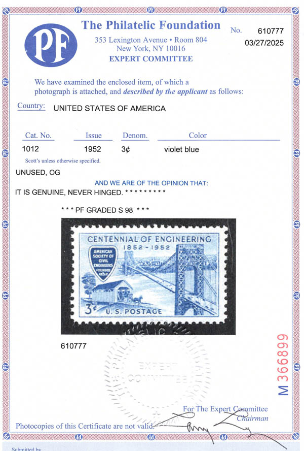 1952, 3¢ Engineering Centennial (Scott 1012), o.g., never hinged, Superb, with 2025 P.F. certificate graded SUP 98. SMQ $65.