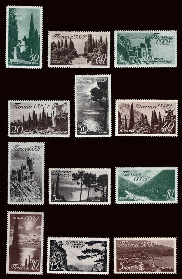 Lote 191![]() /![]() Russia (U.S.S.R.), 1938, Landscapes of Crimea and the Caucasus complete (Scott 666-677), set of 12, o.g., some hinged, many appear n.h. and there is an expert mark in the corners, Fine to Very Fine. Scott $209 as hinged. Michel 625-636. Estimate $60 - 80. |