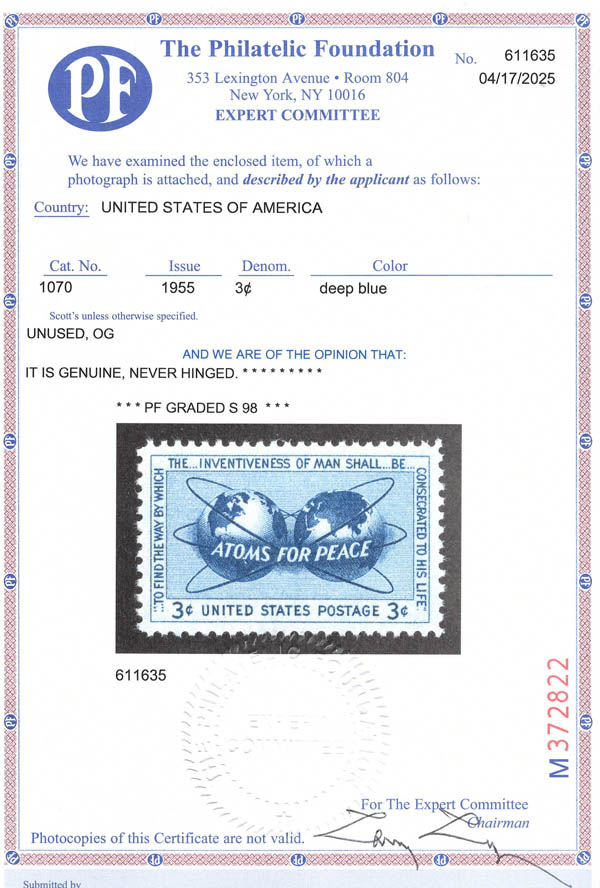 1955, 3¢ Atoms for Peace (Scott 1070), o.g., never hinged, Superb, with 2025 P.F. certificate graded SUP 98. SMQ $75.
