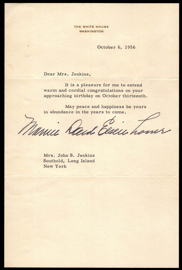 Lote 195 Eisenhower, Mary Geneva "Mamie", (1896-1979), First Lady of the United States from 1953 to 1961 as the wife of President Dwight D. Eisenhower. Born in Boone, Iowa, she was raised in a wealthy household in Colorado. Signed Mamie Doud Eisenhower on a typewritten letter on The White House letterhead to a Mrs. Jenkins dated October 6, 1956; includes the cover it was mailed in. Estimate $150 - 200. |