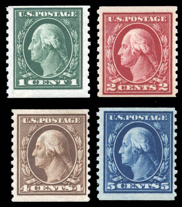 Lote 198![]() /![]() 1914, Washington flat plate coils, 1¢-2¢ and 4¢-5¢, complete less the 3¢ (Scott 443-444, 446-447), o.g., 1¢ and 2¢ never hinged, 4¢ hinge remnant, 5¢ very lightly hinged, Fine to Very Fine. Scott $360. Estimate $75 - 100. |