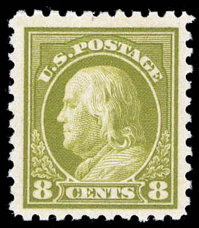 1916, 8¢ Franklin, olive green, unwatermarked, perf. 10 (Scott 470), o.g., never hinged, Very Fine. Scott $165.