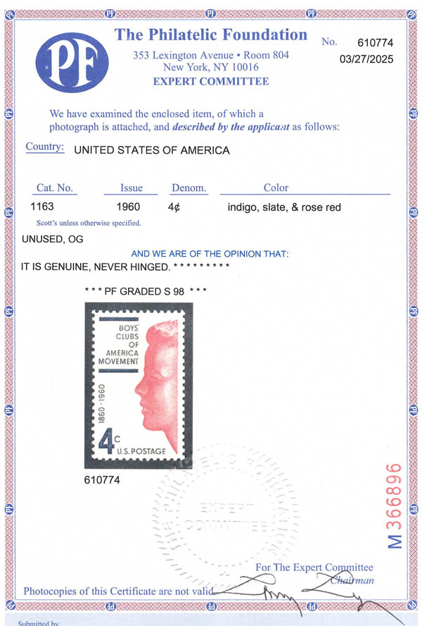1960, 4¢ Boy's Clubs of America (Scott 1163), o.g., never hinged, Superb, with 2025 P.F. certificate graded SUP 98. SMQ $70.
