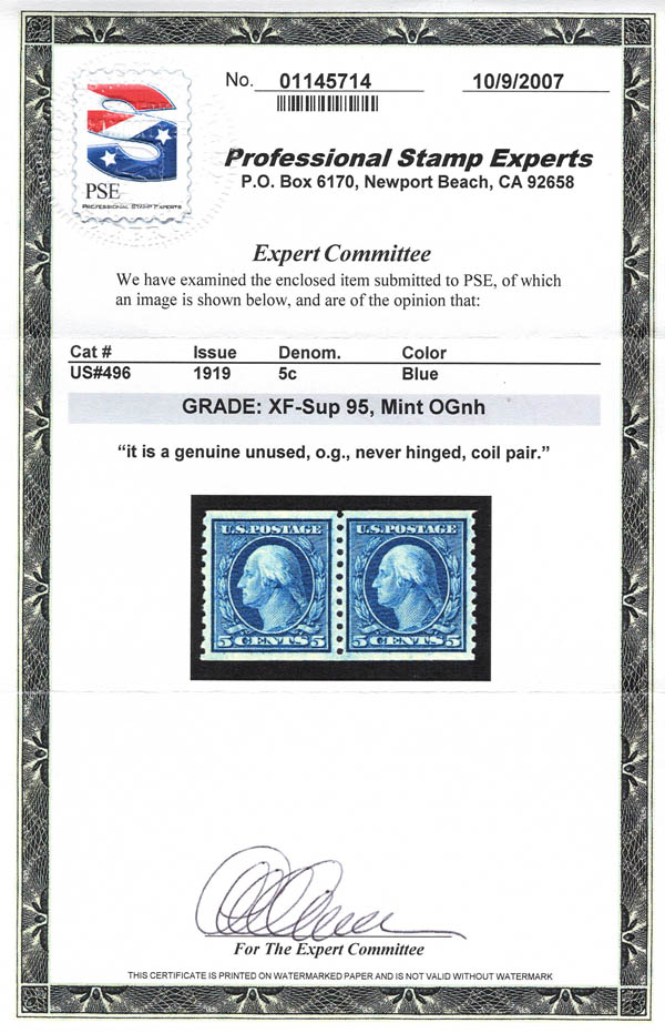 Lote 213![]() ![]() 1919, 5¢ Washington, blue, unwatermarked, horizontal rotary press coil pair (Scott 496), o.g., never hinged, Extremely Fine to Superb, with 2007 P.S.E. certificate graded XF-SUP 95. SMQ $225. Estimate $150 - 200. |
