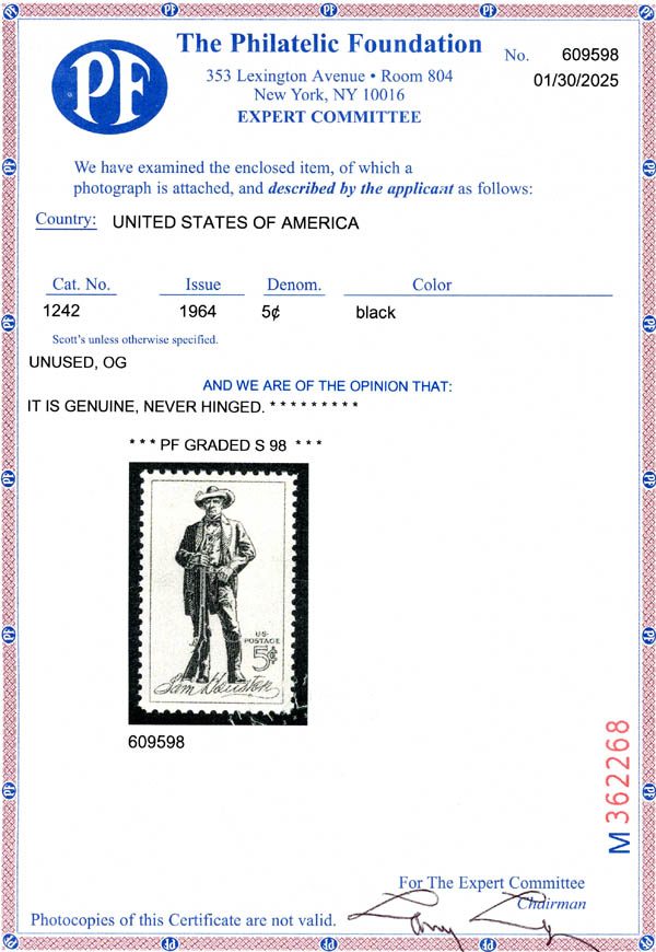 1964, 5¢ Sam Houston (Scott 1242), o.g., never hinged, Superb, with 2025 P.F. certificate graded SUP 98. SMQ $80.