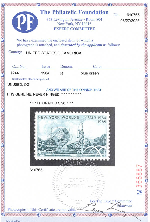 1964, 5¢ New York World's Fair (Scott 1244), o.g., never hinged, Superb, with 2025 P.F. certificate graded SUP 98. SMQ $75.