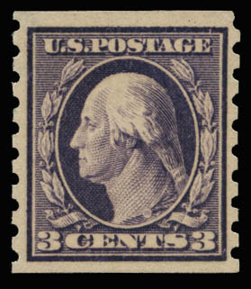 1911, 3¢ deep violet, horizontal coil (Scott 394), beautifully well centered, o.g., never hinged, Very Fine to Extremely Fine.