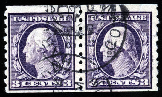 1911, 3¢ deep violet, horizontal coil (Scott 394), pair, fresh and attractive, town cancels, Fine to Very Fine.