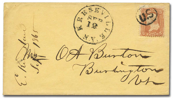 Lote 22![]() 1861, 3¢ Washington, rose (Scott 65), tied by beautifully struck Keesville, N.Y. "U.S." in circle fancy cancel (Skinner-Eno PT-US 51) on a neat 1865 cover to Vermont, Very Fine, ex-Amos Eno. Estimate $250 - 350. |