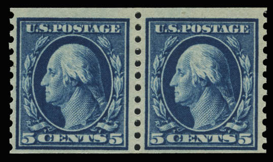 1913, 5¢ blue, horizontal coil (Scott 396), pair, lovely color, o.g., never hinged, Fine to Very Fine.