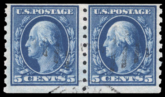 1913, 5¢ Washington, S.L. watermark, horizontal coil (Scott 396), pair, fresh color, light town cancel, Fine. Scott $190.
