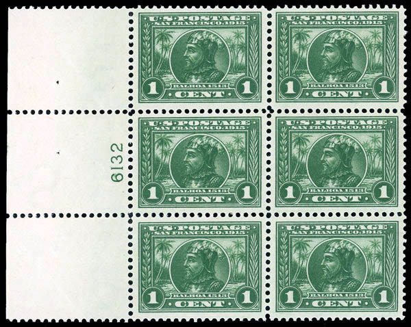 Lote 227![]() /![]() ![]() 1913, 1¢ Panama-Pacific, perf 12 (Scott 397), plate block of 6, an awesomely well centered multiple with deep color, o.g., lightly hinged (4 stamps never hinged), Extremely Fine. Scott $300. Estimate $200 - 300. |