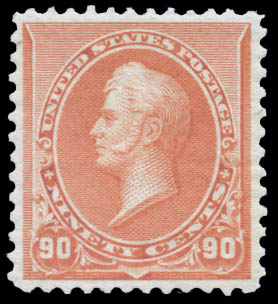 1890, 90¢ orange (Scott 229), mathematically perfect centering, great color, a gem! slightly disturbed o.g., Extremely Fine.