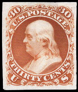 Lote 233 E 1861, 30¢ Franklin, N.B.N.C. "Premiere Gravure" essay, in deep red orange (Scott 71-E2b), plate proof on India paper (formerly No. 61P3), large margins all around, Very Fine to Extremely Fine. Scott $600. Estimate $200 - 300. |