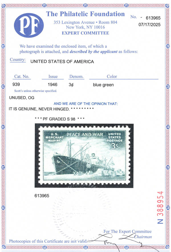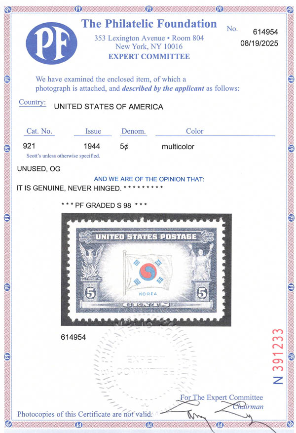 Lote 239![]() ![]() 1944-46, a group of 3 superb graded stamps (Scott 921, 939, 943), including 1944, 5¢ Overrun Countries: Korea; 1946, 3¢ Merchant Marine; and 1946, 3¢ Smithsonian Institution, o.g., never hinged, Superb, all with 2025 P.F. certificates graded SUP 98. SMQ $160. Estimate $80 - 120. |