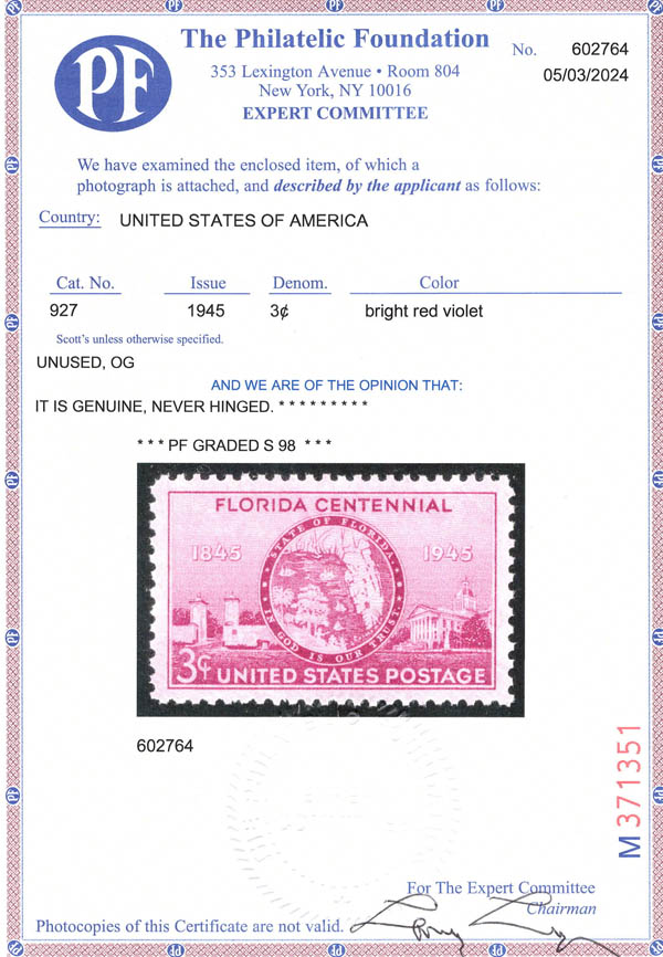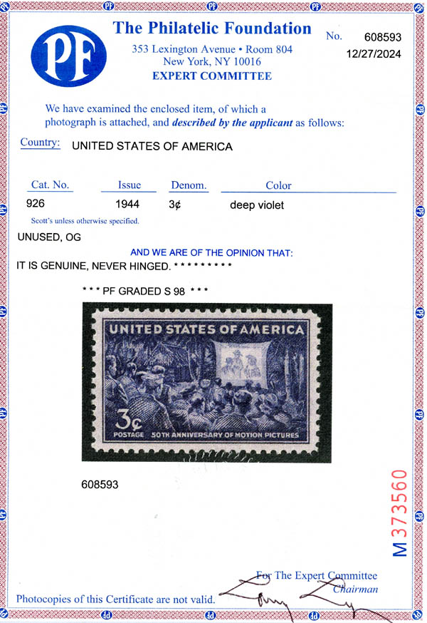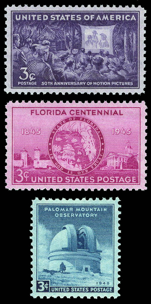 Lote 240![]() ![]() 1944-48, a group of 3 superb graded commemorative stamps (Scott 926, 927, 966), including 1944, 3¢ Motion Pictures; 1945, 3¢ Florida Statehood; and 1948, 3¢ Palomar Observatory, o.g., never hinged, Superb, all with 2024 P.F. certificate graded SUP 98. SMQ $275. Estimate $180 - 240. |