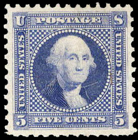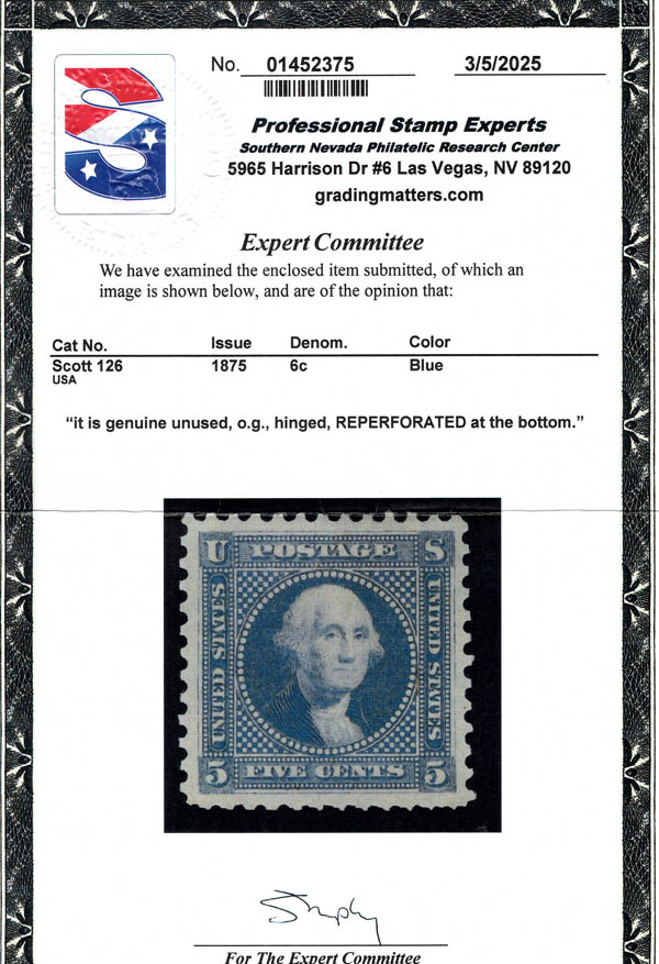 Lote 251 E 1869, 5¢ Washington essay, small lettering, in blue (Scott 115-E2d. Brazer 115aE-Fd), plate perf on wove, perf'd and gummed, o.g., hinged; reperfed at bottom, Extremely Fine appearance, with 2025 P.S.E. certificate, which mistakenly identifies it as #126 (the 6¢ Re-issue). Scott $200. Estimate $60 - 80. |