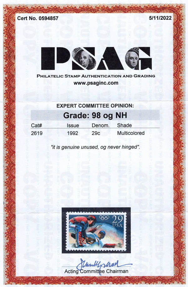 1992, 29¢ Olympic Baseball (Scott 2619), one-in-a-million centering, o.g., never hinged, Superb, with 2022 P.S.A.G. certificate graded SUP 98.