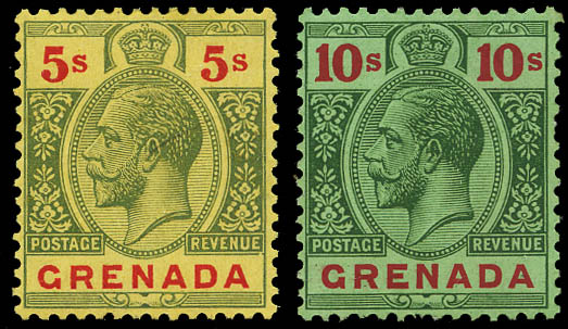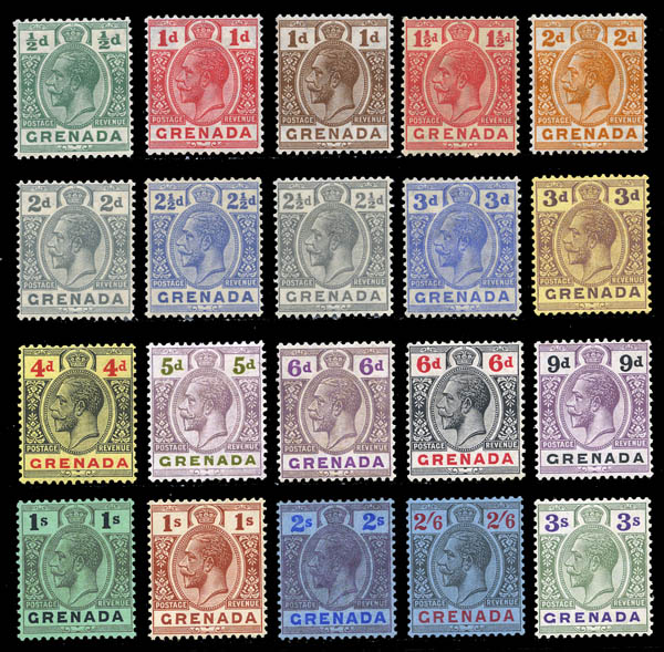Lote 259![]() Grenada, 1921-29, King George V, ½d to 10s complete, Multiple Script CA watermark (SG 112/119, 121/134. Scott 91-112), set of 22, o.g., hinged, Fine to Very Fine. SG £150 ($190). Scott $147. Estimate $50 - 75. |