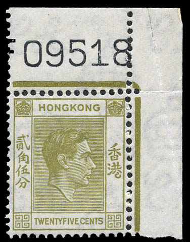 Lote 271![]() ![]() Hong Kong, 1938, King George VI, 30¢ yellow olive, perf. 14 (SG 151. Scott 161), o.g., never hinged, trivial crease in margin, Very Fine overall. SG £150 for n.h. ($190). Scott $75 for hinged. Estimate $50 - 75. |