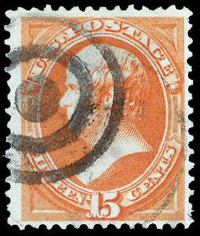 Lote 273 o 1873, 15¢ Webster, yellow orange, C.B.N.C. printing (Scott 163), bulls eye cancel; minute corner crease at lower right, Fine to Very Fine overall, with 2024 P.S.A.G. certificate. Scott $160. Estimate $50 - 75. |