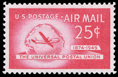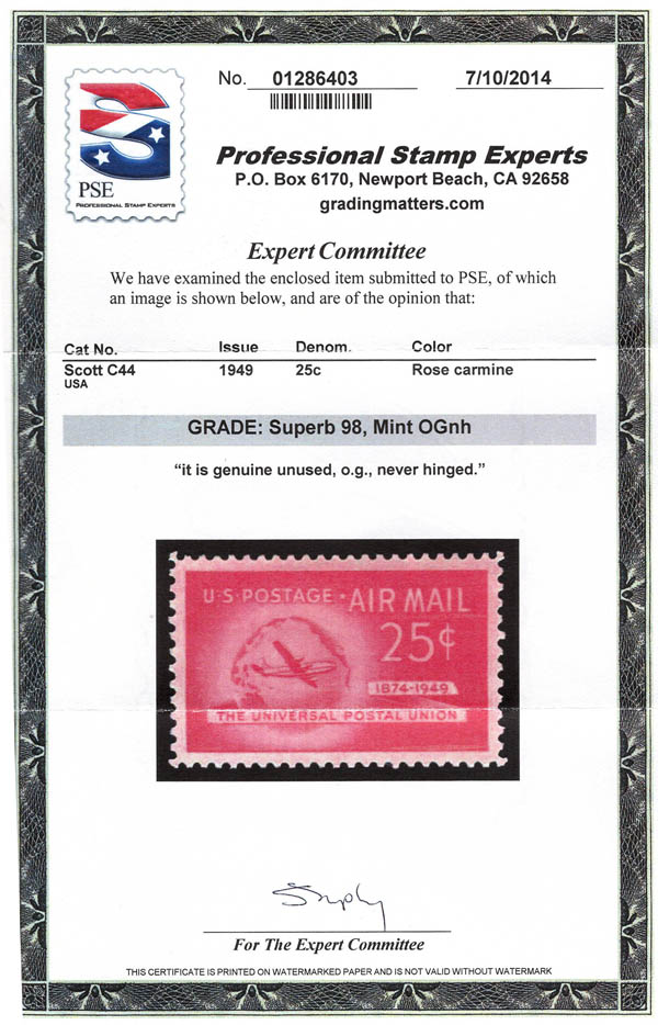 Airmail, 1949, 25¢ U.P.U. (Scott C44), perfect in every respect, o.g., never hinged, Superb, with 2014 P.S.E. certificate graded SUP 98. SMQ $70.