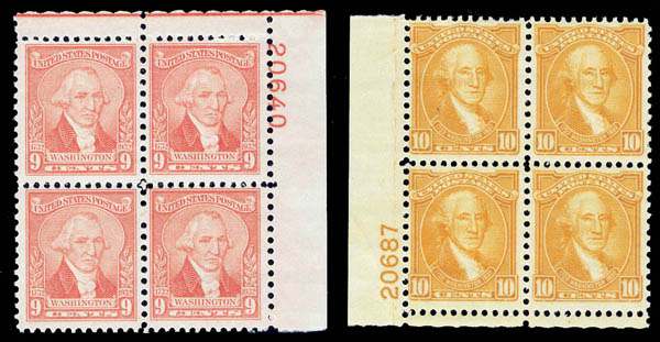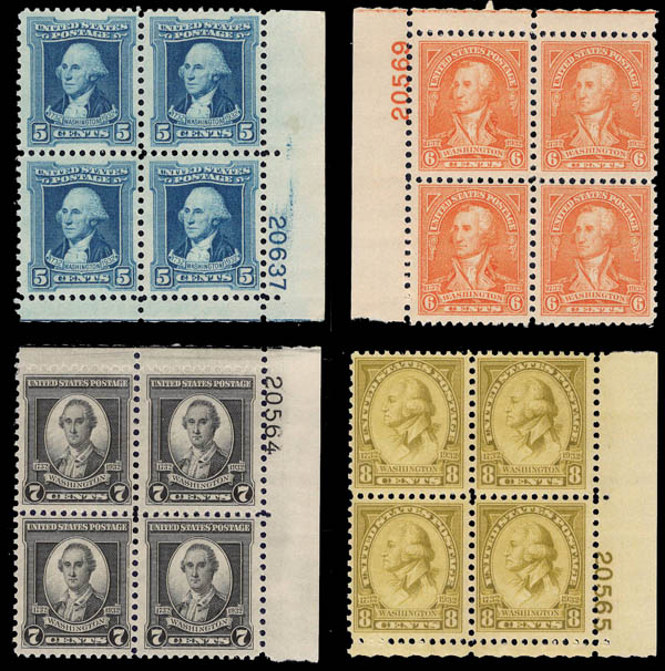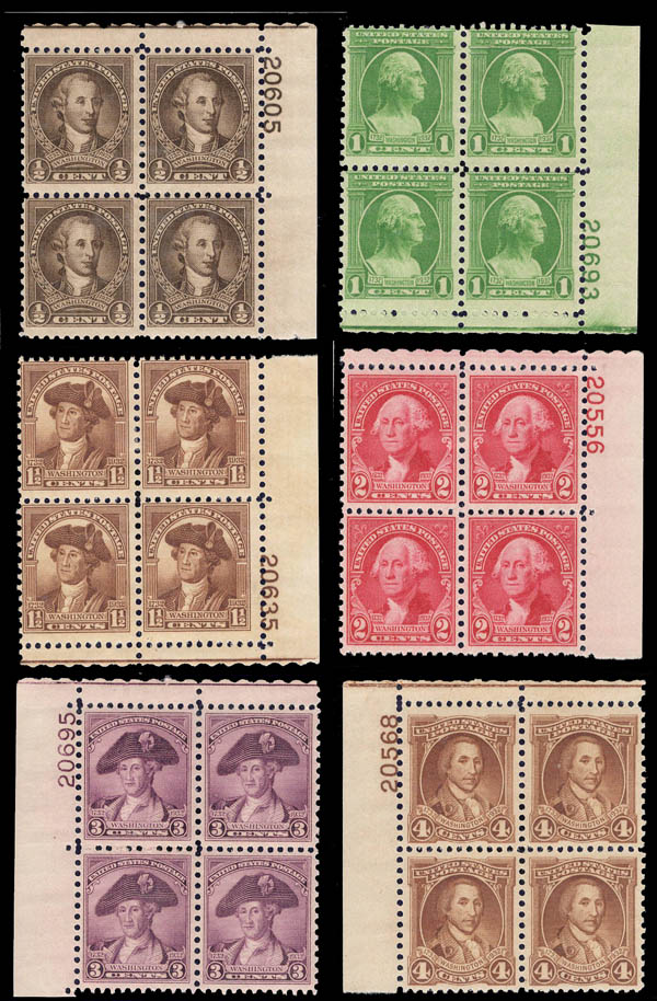 1932, Washington Bicentennial complete (Scott 704-715), set of 12, plate blocks of 4, o.g., 3¢-8¢ are never hinged, Fine to Very Fine. Scott $315.
