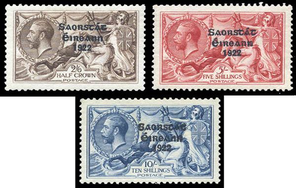 Lote 290![]() Ireland, 1925, Free State overprints on King George V "Seahorses", narrow dates, 2s6d to 10s complete (SG 83/85. Scott 77-79), well centered throughout, o.g., hinged or hinge remnant, Very Fine. SG £250 ($320). Scott $390. Estimate $100 - 150. |