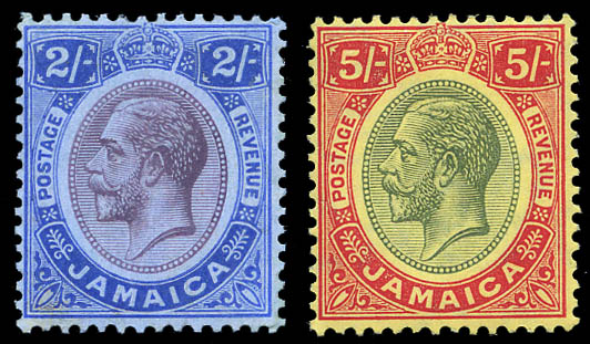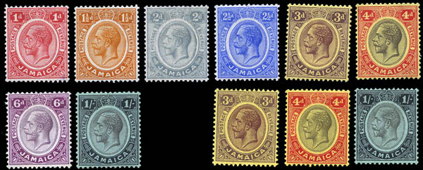 Lote 297![]() Jamaica, 1912-20, King George V, 1d to 5s complete, including the 3 white back varieties (SG 58/67, 62a, 63a, 65a. Scott 61-73), set of 13, o.g., hinged, Fine to Very Fine. SG £118 ($150). Scott $137. Estimate $40 - 60. |