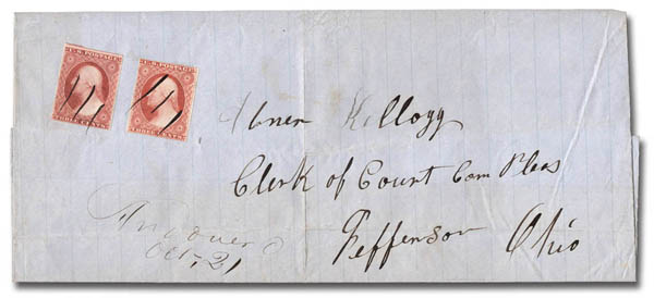 1851, 3¢ Washington, orange brown, type I and 1852, 3¢ Washington, dull red, type I (Scott 10, 11), a rare combination used on one cover, Fine to Very Fine. Scott $278.