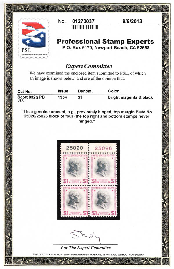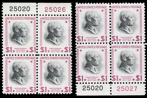 Lote 300![]() ![]() 1954, $1 Wilson, bright magenta & black (Scott 832g), two plate blocks of 4, first block o.g., one stamp is hinged, all others n.h.; second block is n.h., Fine to Very Fine, with 2013 P.S.E. certificate. Scott $800. Estimate $200 - 300. |