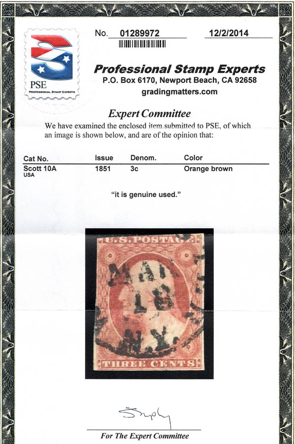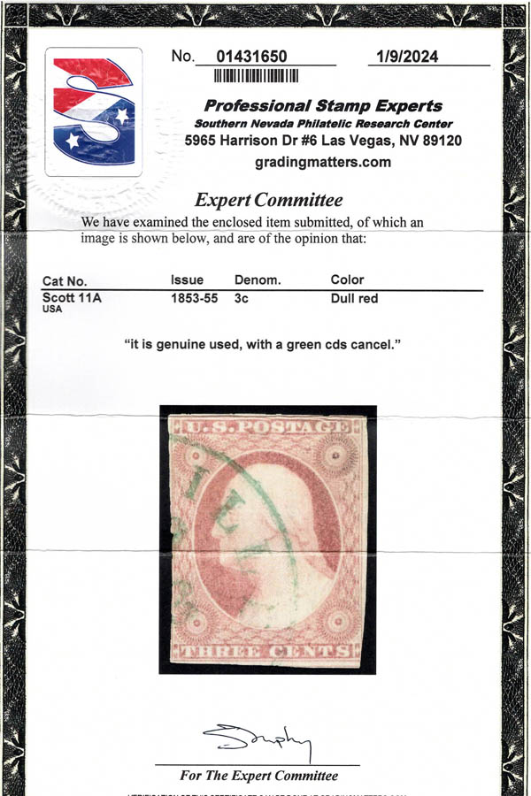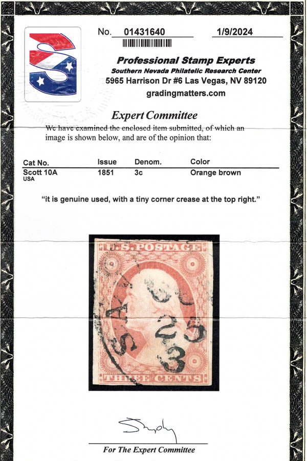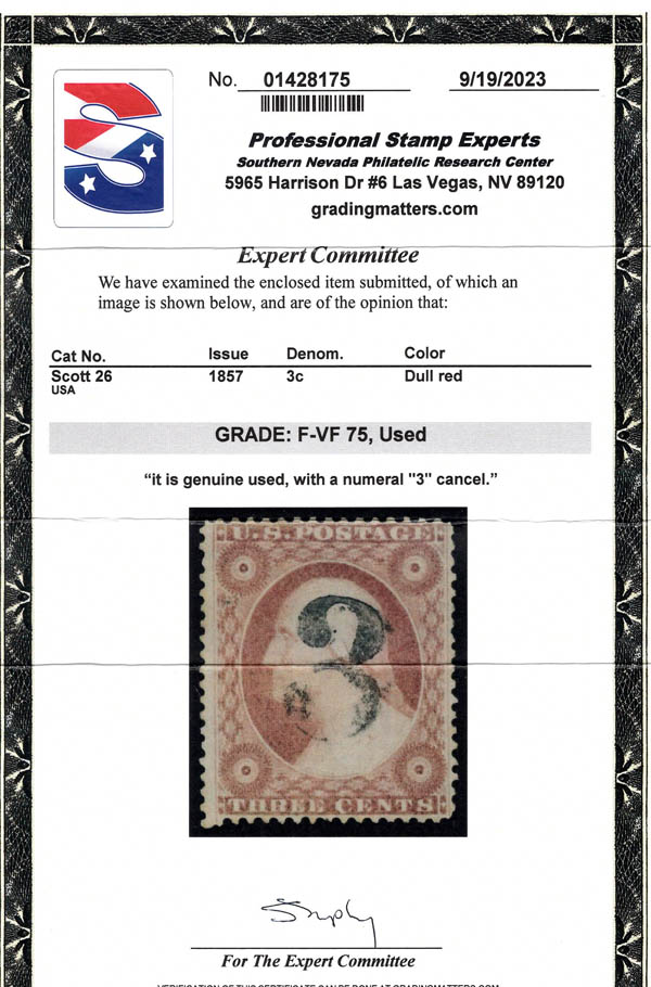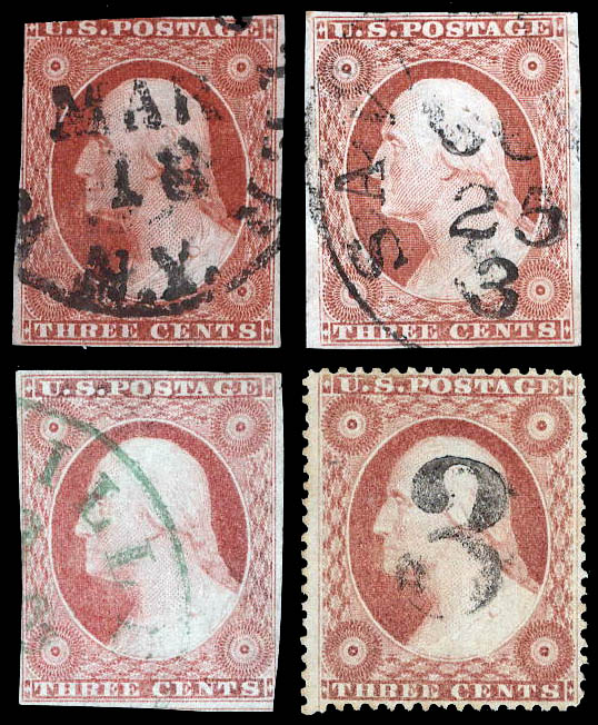 1851-57, 3¢ Washington, a group of 4 (Scott 10A, 11A, 26), neat cancels, #10 is V.G., others are Fine to Very Fine, each with 2023-24 P.S.E. certificate. Scott $345.
