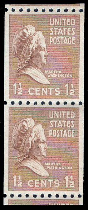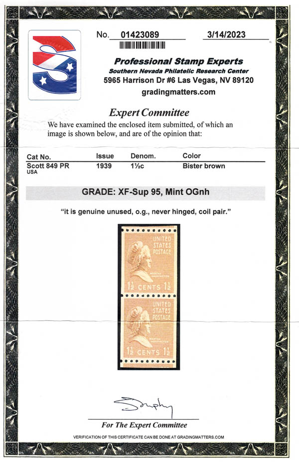 1939, 1½¢ Martha Washington, vertical coil (Scott 849), pair, o.g., never hinged, Extremely Fine To Superb, with 2023 P.S.E. certificate graded XF-SUP 95. SMQ $135.