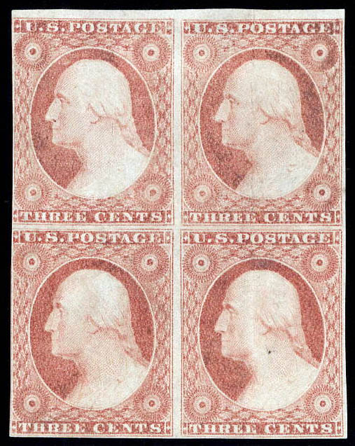1852, 3¢ Washington, dull red, type II (Scott 11A), block of 4, unused without gum, Fine to Very Fine overall (the pair at right is Very Fine). Scott $340.