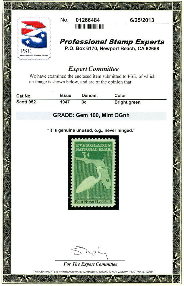 1947, 3¢ Everglades National Park (Scott 952), o.g., never hinged, Superb, with 2013 P.S.E. certificate graded GEM 100. SMQ $170.