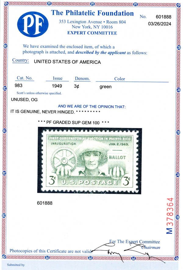1949, 3¢ Puerto Rico Election (Scott 983), o.g., never hinged, Superb, with 2024 P.F. certificate graded GEM 100. SMQ $130.