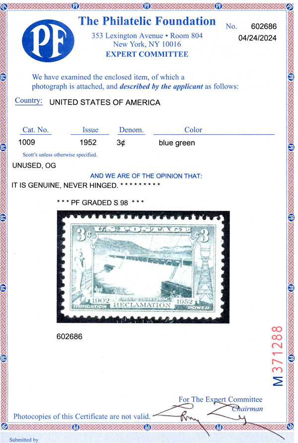 1952, 3¢ Grand Coulee Dam (Scott 1009), o.g., never hinged, Superb, with 2024 P.F. certificate graded SUP 98. SMQ $110.